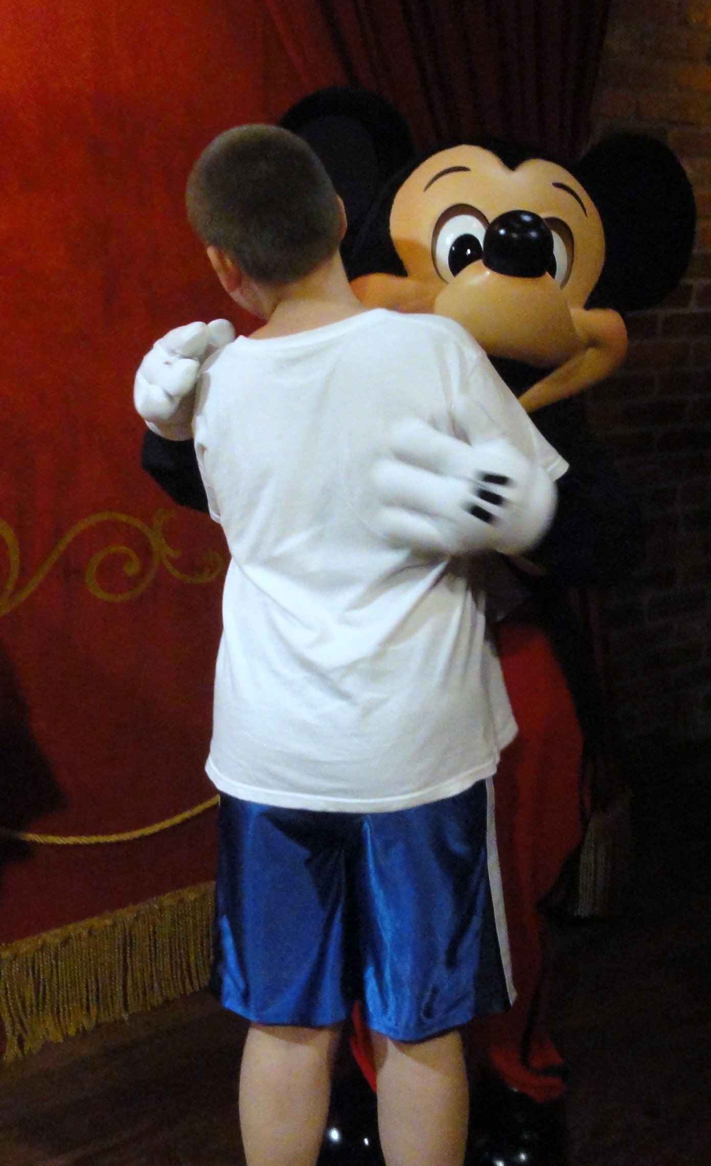 Prior to our meet, we had time to explore the Magic Kingdom, and of course we had to bring Ben to see his buddy, Mickey. Here he is in a hug: